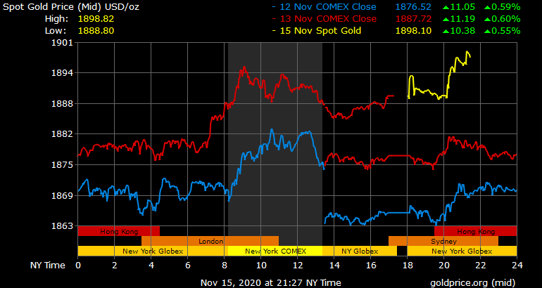 Giá vàng tương lai giao tháng 12 trên sàn Comex New York tăng 11 USD lên 1.897,2 USD/ounce.