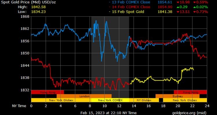 Giá vàng tương lai giao tháng 4/2023 trên sàn Comex New York giảm 20,1 USD xuống 1.845,3 USD/ounce.