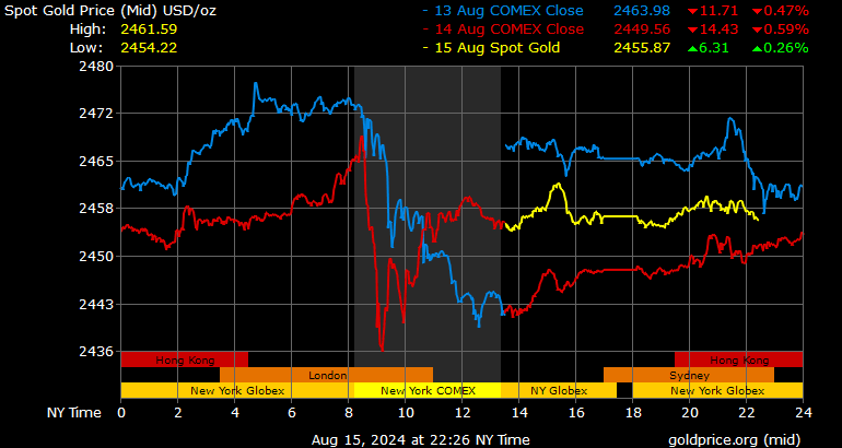 Trên thị trường vàng thế giới, giá vàng giao ngay chốt phiên hôm qua tại Mỹ tăng 8,6 USD lên 2.456,5 USD/ounce. Sang phiên châu Á sáng nay, giá vàng đảo chiều giảm nhẹ 1,4 USD xuống 2.455,1 USD/ounce.
