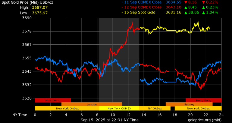 Trên thị trường vàng thế giới, giá vàng giao ngay chốt phiên hôm qua tại Mỹ tăng 35,7 USD lên mức 3.678,8 USD/ounce. Sang phiên châu Á sáng nay, giá vàng tiếp tục nhích nhẹ 1,5 USD lên 3.680,3 USD/ounce.