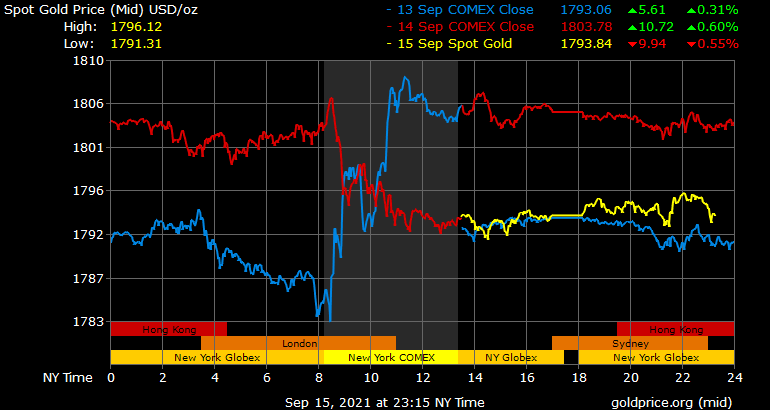 Trên thị trường vàng thế giới, giá vàng giao ngay chốt phiên đêm qua tại Mỹ giảm 10,5 USD xuống 1.794,1 USD/ounce. Sang phiên châu Á sáng nay, giá vàng gần như chỉ đi ngang quanh ngưỡng trên.