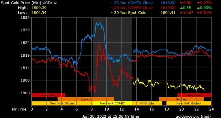 Giá vàng tương lai giao tháng 8/2022 trên sàn Comex New York giảm 10,2 USD xuống 1.807,3 USD/ounce.