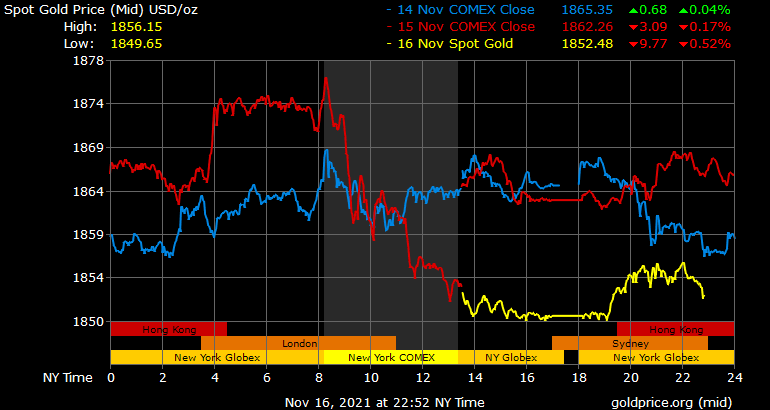 Trên thị trường vàng thế giới, giá vàng giao ngay chốt phiên đêm qua tại Mỹ giảm 11,8 USD xuống 1.850,4 USD/ounce. Sang phiên châu Á sáng nay, giá vàng hồi phục lên gần 1.855 USD/ounce.