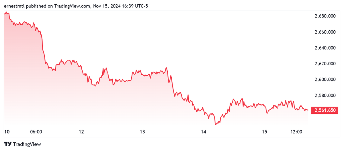 Giá vàng tiếp tục giảm trong tuần này, chịu sức ép từ sự kết hợp mạnh mẽ của tâm lý hưng phấn sau bầu cử, động thái cứng rắn mới của Fed, đồng đô la Mỹ tăng mạnh và môi trường địa chính trị tương đối yên tĩnh.