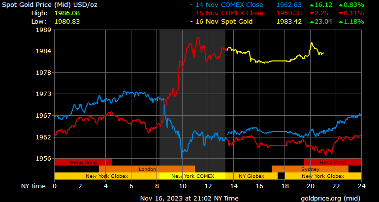 Giá vàng tương lai giao tháng 12/2023 trên sàn Comex New York tăng 23 USD, tương ứng tăng 1,17% xuống 1.987,3 USD/ounce.