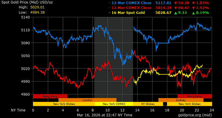 Trên thị trường vàng thế giới, giá vàng giao ngay chốt phiên hôm qua tại Mỹ giảm 14 USD, tương ứng giảm 0,28% xuống mức 5.006,6 USD/ounce. Sang phiên châu Á sáng nay, giá vàng đảo chiều tăng 21 USD lên mức 5.027,6 USD/ounce.