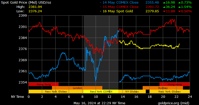 Giá vàng tương lai giao tháng 6/2024 trên sàn Comex New York giảm 9,4 USD, tương ứng giảm 0,39% xuống mức 2.385,5 USD/ounce.