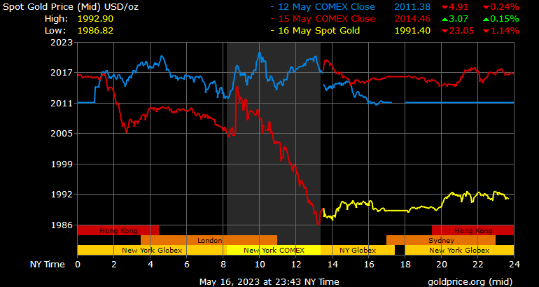 Giá vàng tương lai giao tháng 6/2023 trên sàn Comex New York giảm 29,7 USD, tương ứng giảm 1,47% xuống 1.993 USD/ounce.