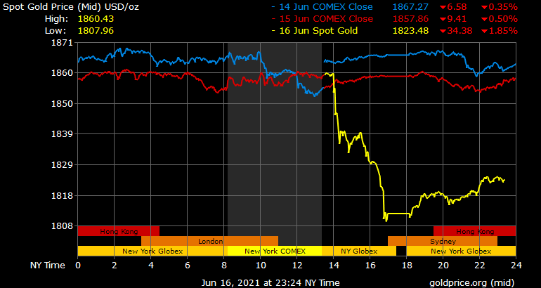 Vàng thế giới phiên ngày thứ Tư bị bán tháo ồ ạt do đồng USD và lợi suất trái phiếu Mỹ nhảy vọt, nhờ việc Fed nâng dự báo lạm phát từ 2,4% lên 3,4% trong năm nay và phát đi tín hiệu sẽ bắt đầu tăng lãi suất vào năm 2023, sớm hơn một năm so với dự kiến.