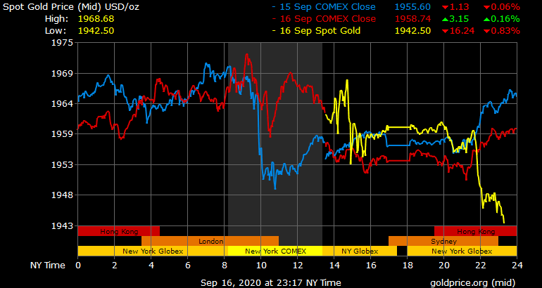 Trên thị trường vàng thế giới, giá vàng giao ngay chốt phiên đêm qua tại Mỹ tăng 5,8 USD lên 1.958,8 USD/ounce. Sang phiên châu Á sáng nay, giá vàng đột ngột giảm nhanh xuống gần 1.940 USD/ounce. Giá vàng tương lai giao tháng 10 trên sàn Comex New York giảm 17,4 USD xuống 1.944,6 USD/ounce.