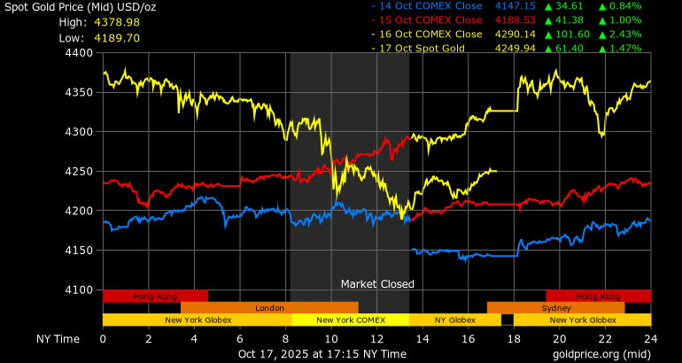 Giá vàng tăng cao và đạt mức cao kỷ lục mới qua đêm, ở mức 4.392 USD/ounce, dựa trên hợp đồng tương lai Comex tháng 12. Tuy nhiên, sau đó kim loại quý này đã quay đầu giảm khá mạnh.