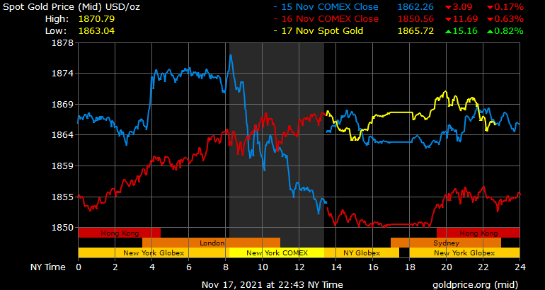 Trên thị trường vàng thế giới, giá vàng giao ngay chốt phiên đêm qua tại Mỹ tăng 16,9 USD lên 1.867,3 USD/ounce. Sang phiên châu Á sáng nay, giá vàng giảm nhẹ gần gần 1.865 USD/ounce.