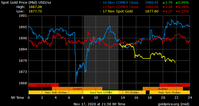 Trên thị trường vàng thế giới, giá vàng giao ngay chốt phiên đêm qua tại Mỹ giảm 8,6 USD xuống 1.880 USD/ounce. Sang phiên châu Á sáng nay, giá vàng giảm nhẹ xuống gần 1.878 USD/ounce. Giá vàng tương lai giao tháng 12 trên sàn Comex New York giảm 8,4 USD xuống 1.876,7 USD/ounce.
