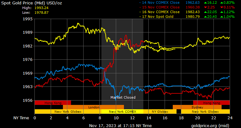Giá vàng tương lai giao tháng 12/2023 trên sàn Comex New York giảm 2,6 USD, tương ứng giảm 0,13% xuống 1.984,7 USD/ounce.