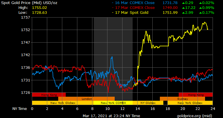 Giá vàng tương lai giao tháng 4 trên sàn Comex New York tăng 25,7 USD lên 1.752,8 USD/ounce.