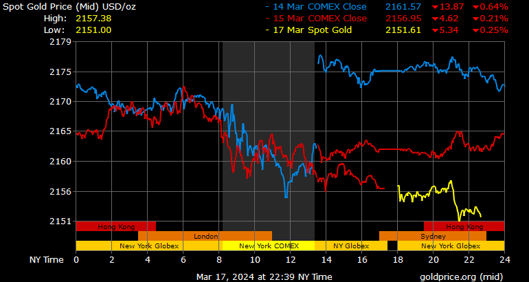Trên thị trường vàng thế giới, giá vàng giao ngay chốt phiên cuối tuần qua tại Mỹ giảm 6,1 USD xuống 2.156 USD/ounce. Sang phiên châu Á sáng nay, giá vàng tiếp tục giảm nhẹ 4,5 USD xuống 2.151,5 USD/ounce.