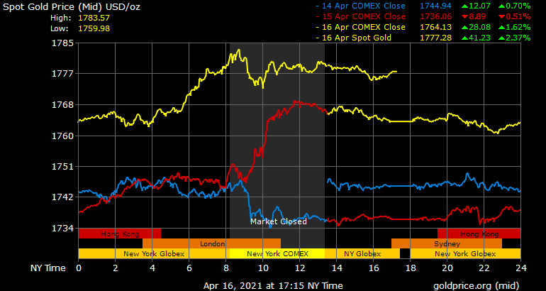 Trên thị trường vàng thế giới, giá vàng giao ngay chốt phiên cuối tuần tại Mỹ tăng 12,9 USD lên 1.776,5 USD/ounce. Giá vàng tương lai giao tháng 5 trên sàn Comex New York tăng 11 USD lên 1.776,8 USD/ounce.