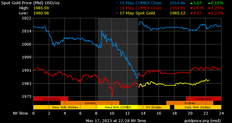 Giá vàng tương lai giao tháng 6/2023 trên sàn Comex New York giảm 8,1 USD, tương ứng giảm 0,41% xuống 1.984,9 USD/ounce.
