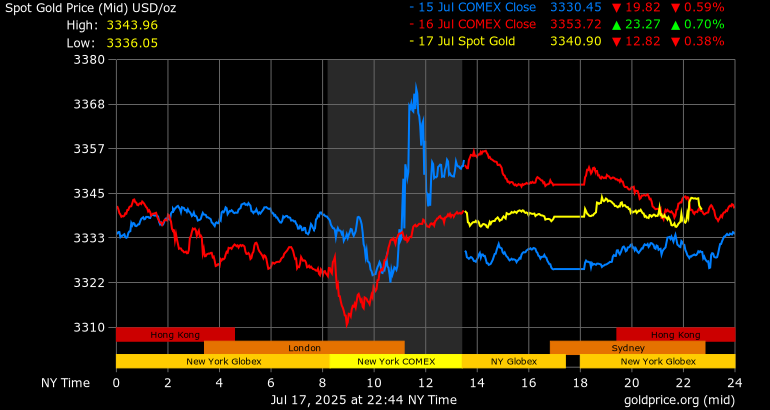 Giá vàng tương lai giao tháng 8/2025 trên sàn Comex New York giảm 13,8 USD, tương ứng giảm 0,41% xuống mức 3.345,3 USD/ounce.