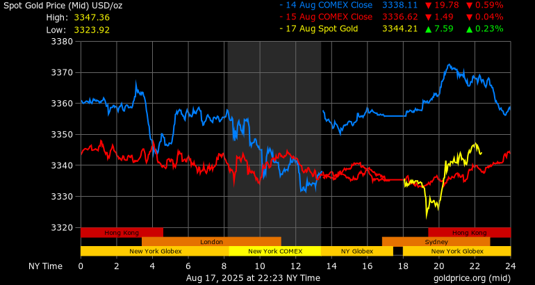 Trên thị trường vàng thế giới, giá vàng giao ngay chốt phiên cuối tuần qua tại Mỹ nhích nhẹ 0,1 USD lên mức 3.335,7 USD/ounce. Sang phiên châu Á sáng nay, giá vàng tiếp tục tăng 8,8 USD lên 3.344,5 USD/ounce.