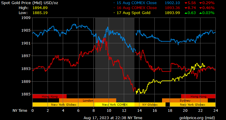 Trên thị trường vàng thế giới, giá vàng giao ngay chốt phiên hôm qua tại Mỹ giảm 2,4 xuống 1.889 USD/ounce. Sang phiên châu Á sáng nay, giá vàng đảo chiều hồi nhẹ lên mức 1.893,2 USD/ounce.