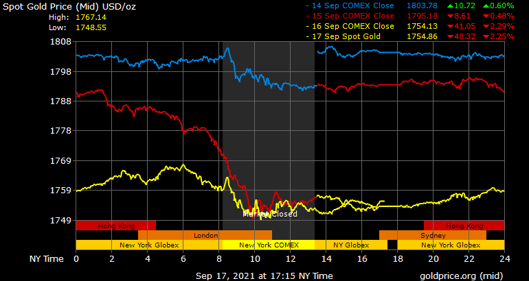 Trên thị trường vàng thế giới, giá vàng giao ngay chốt phiên đêm qua tại Mỹ tăng 0,1 USD lên 1.753,8 USD/ounce. Giá vàng tương lai giao tháng 10 trên sàn Comex New York giảm 2,4 USD xuống 1.752,2 USD/ounce.