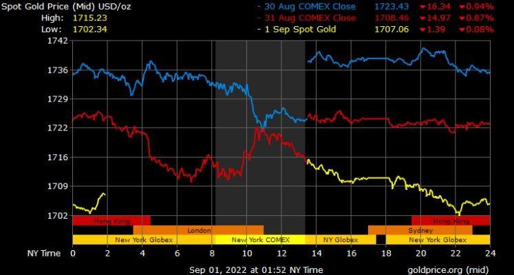 Giá vàng hôm nay ngày 1/9: Vàng lùi về sát mốc 1.700 USD/ounce