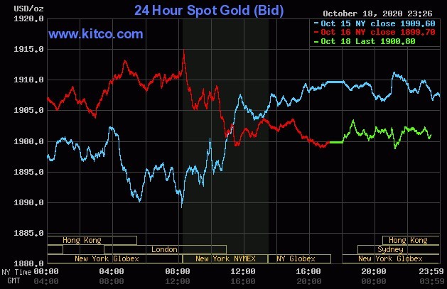 Trên thị trường vàng thế giới, giá vàng giao ngay chốt phiên cuối tuần qua tại Mỹ giảm 9,9 USD xuống 1.899,7 USD/ounce. Sang phiên châu Á sáng nay, giá vàng nhích nhẹ lên trên 1.900 USD/ounce và đi ngang trong biên độ hẹp sau đó. Giá vàng tương lai giao tháng 11 trên sàn Comex New York giảm 2 USD xuống 1.900,4 USD/ounce.