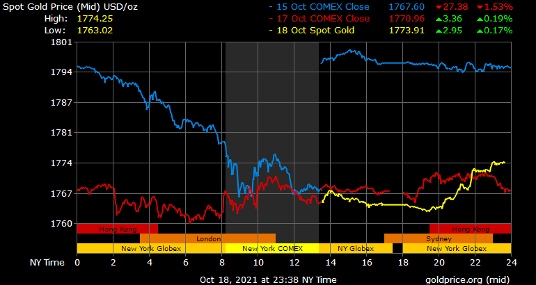 Giá vàng tương lai giao tháng 11 trên sàn Comex New tăng 8,9 USD lên 1.774 USD/ounce.
