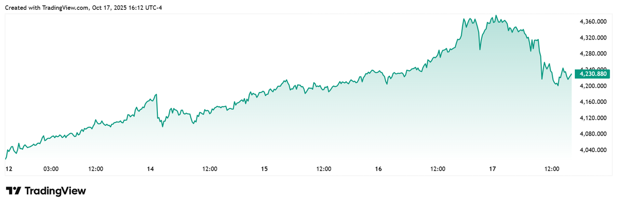Giá vàng tương lai giao tháng 12/2025 trên sàn Comex New York giảm mạnh 91,3 USD, tương ứng giảm 2,12% xuống mức 4.213,3 USD/ounce. Tính chung tuần qua, giá vàng tương lai tăng 212,9 USD, tương ứng tăng 5,32%.