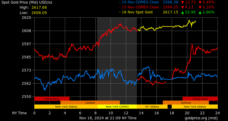 Giá vàng tương lai giao tháng 12/2024 trên sàn Comex New York tăng 44,5 USD, tương ứng tăng 1,73% lên mức 2.614,6 USD/ounce.