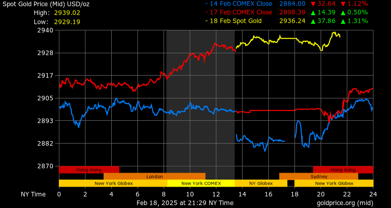 Trên thị trường vàng thế giới, giá vàng giao ngay chốt phiên hôm qua tại Mỹ tăng mạnh 36,9 USD, tương ứng tăng 1,27% lên mức 2.935,4 USD/ounce. Sang phiên châu Á sáng nay, giá vàng tăng nhẹ 1 USD lên 2.936,4 USD/ounce.