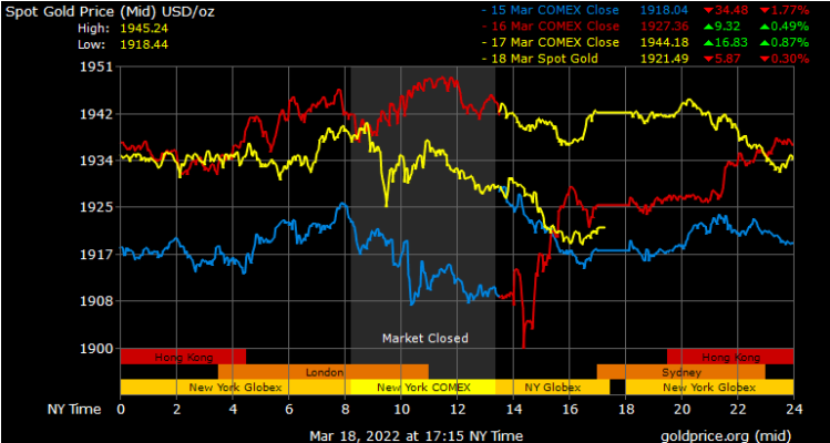 Giá vàng tương lai giao tháng 4/2022 trên sàn Comex New York giảm 14,3 USD xuống 1.931,7 USD/ounce.