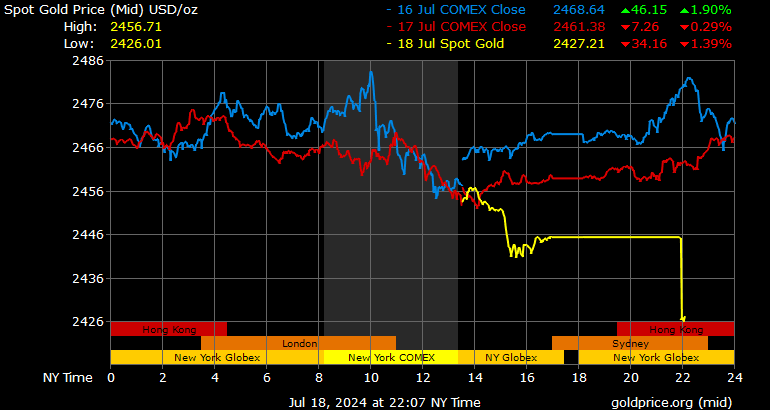 Trên thị trường vàng thế giới, giá vàng giao ngay chốt phiên hôm qua tại Mỹ giảm 13,5 USD xuống 2.445,3 USD/ounce. Sang phiên châu Á sáng nay, giá vàng tiếp tục giảm 17,9 USD xuống 2.427,4 USD/ounce.