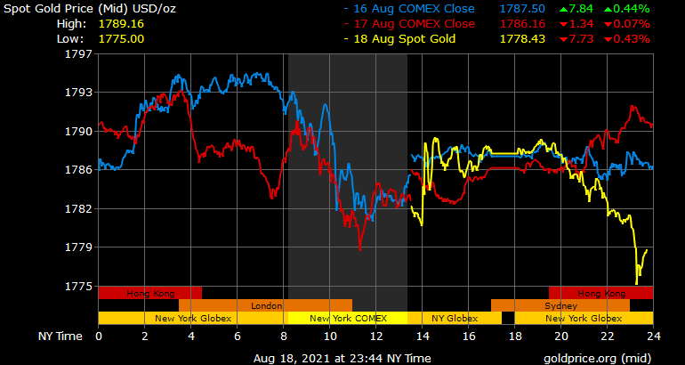 Trên thị trường vàng thế giới, giá vàng giao ngay chốt phiên đêm qua tại Mỹ tăng 2 USD lên 1.788,1 USD/ounce. Sang phiên châu Á sáng nay, giá vàng giảm về sát 1.777 USD/ounce.