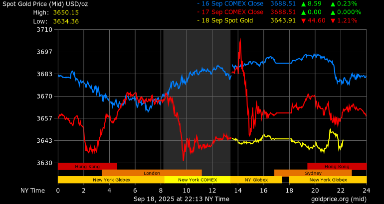 Giá vàng tương lai giao tháng 12/2025 trên sàn Comex New York giảm 39,5 USD, tương ứng giảm 1,06% xuống mức 3.678,3 USD/ounce.