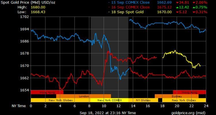 Giá vàng tương lai giao tháng 10/2022 trên sàn Comex New York tăng 6 USD lên 1.672,8 USD/ounce.