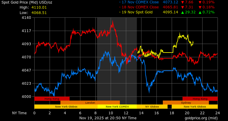 Giá vàng tương lai giao tháng 12/2025 trên sàn Comex New York tăng 16,3 USD, tương ứng tăng 0,4% lên mức 4.082,8 USD/ounce.