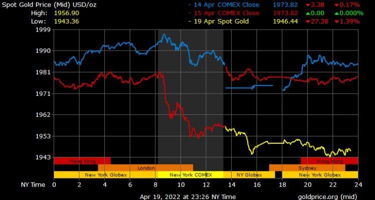 Giá vàng tương lai giao tháng 6/2022 trên sàn Comex New York giảm 27,4 USD xuống mức 1.959 USD/ounce.