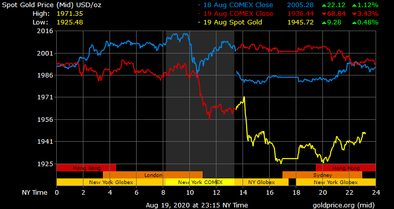 Trên thị trường vàng thế giới, giá vàng giao ngay chốt phiên đêm qua tại Mỹ giảm 72,4 USD xuống 1.927,9 USD/ounce. Sang phiên châu Á sáng nay, giá hồi phục khá nhanh lên trên 1.945 USD/ounce. Giá vàng tương lai giao tháng 9 trên sàn Comex New York giảm 16,5 USD xuống 1.944 USD/ounce.