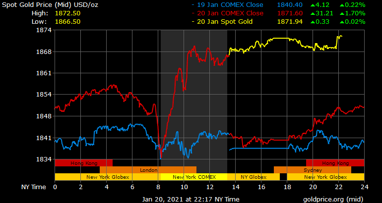 Giá vàng thế giới phiên ngày thứ Tư tăng khá mạnh sau khi ông Joe Biden nhậm chức Tổng thống Mỹ với cam kết chi tiêu lớn để phục hồi nền kinh tế, trong đó, bắt đầu là gói 1.900 tỷ USD. Chi tiêu lớn và chính sách nới lỏng vốn đang thực thi sẽ chắc chắn khiến lạm phát gia tăng và qua đó ủng hộ đà tăng của vàng.