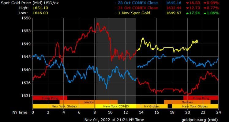 Giá vàng tương lai giao tháng 12/2022 trên sàn Comex New York tăng 9 USD lên mức 1.649,7 USD/ounce.