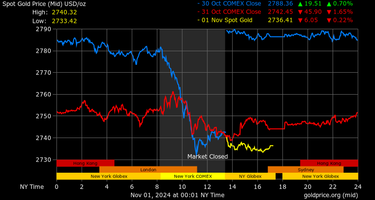 Trên thị trường vàng thế giới, giá vàng giao ngay chốt phiên hôm qua tại Mỹ giảm 7,9 USD xuống 2.735,5 USD/ounce.