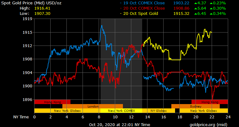 Trên thị trường vàng thế giới, giá vàng giao ngay chốt phiên đêm qua tại Mỹ tăng 2,6 USD lên 1.905,8 USD/ounce. Sang phiên châu Á sáng nay, giá tăng khá mạnh lên trên 1.915 USD/ounce. Giá vàng tương lai giao tháng 11 trên sàn Comex New York tăng 3,6 USD lên 1.915,2 USD/ounce.