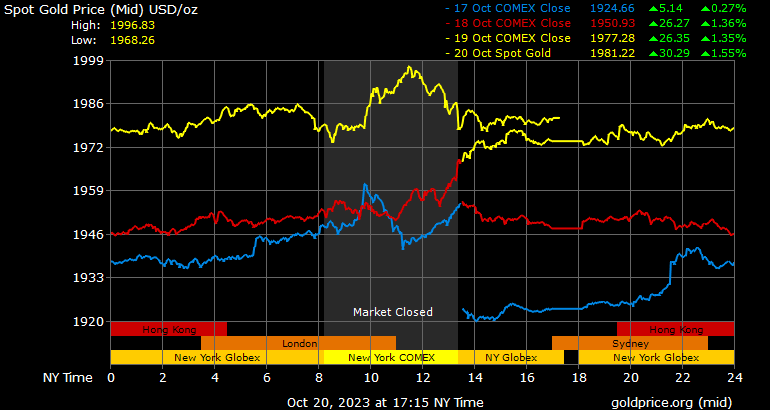 Tương tự như tuần trước, vàng đang có lực mua mạnh vào thứ Sáu (ngày 20/10) do các nhà đầu tư muốn giữ một ít vàng để bảo hiểm vào cuối tuần. Có những báo cáo và tin đồn rằng quân đội Israel có thể tiến hành một cuộc tấn công trên bộ vào Gaza vào cuối tuần qua. Nhu cầu trú ẩn an toàn này đã đẩy giá vàng lên mức cao nhất trong 3 tháng.