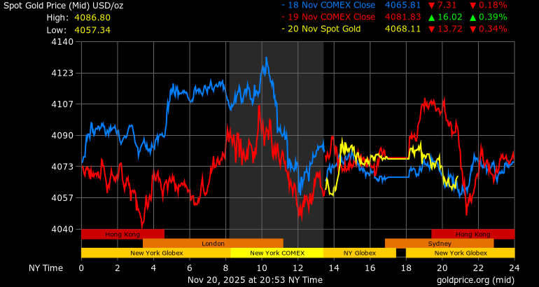 Giá vàng tương lai giao tháng 12/2025 trên sàn Comex New York giảm 22,8 USD, tương ứng giảm 0,56% xuống mức 4.060 USD/ounce.
