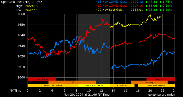 Giá vàng tương lai giao tháng 12/2024 trên sàn Comex New York tăng 20,7 USD, tương ứng tăng 0,79% lên mức 2.651,7 USD/ounce.