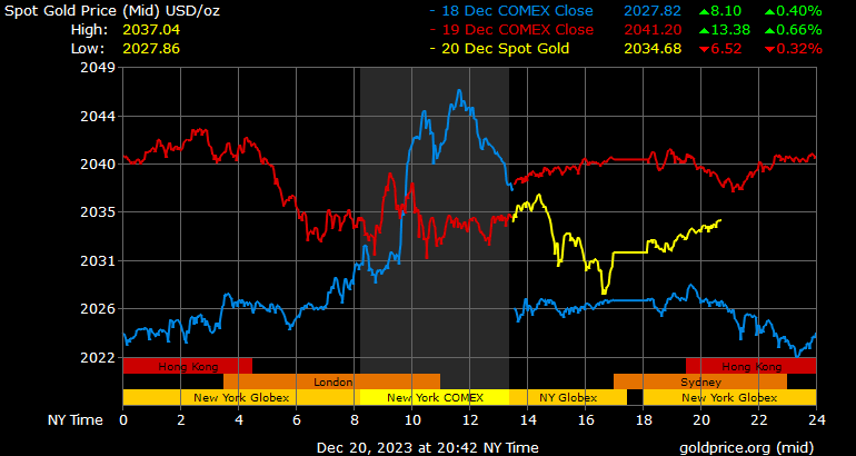 Giá vàng tương lai giao tháng 2/2024 trên sàn Comex New York giảm 4,4 USD, tương ứng giảm 0,21% xuống 2.047,7 USD/ounce.