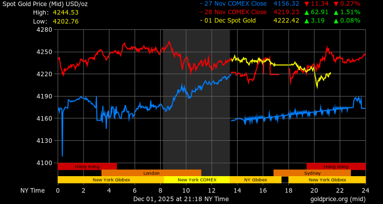 Trên thị trường vàng thế giới, giá vàng giao ngay chốt phiên hôm qua tại Mỹ tăng 16,5 USD, tương ứng tăng 0,39% lên mức 4.232,3 USD/ounce. Sang phiên châu Á sáng nay, giá vàng đảo chiều giảm 12,6 USD xuống 4.219.7 USD/ounce.