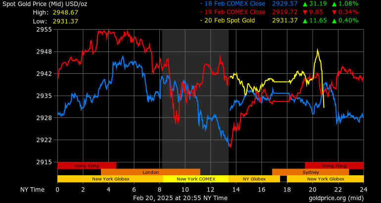Giá vàng tương lai giao tháng 4/2025 trên sàn Comex New York tăng 20 USD, tương ứng tăng 0,68% lên mức 2.956,1 USD/ounce.